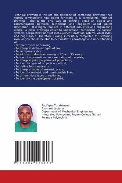 Technical drawing is the act and discipline of composing drawings that visually communicate how object functions or is constructed. Technical drawing also is the only way of defining detail an object and communication between technicians and engineers about object description. It is highly required in different industries and engineering works. To make drawings easier to understand, technicians use familiar symbols, perspectives, units of measurement, notation systems, visual styles, and page layout. Therefore, Having successfully completed this lecturing manual, you should be able to demonstrate knowledge and understanding of:- Different types of drawing;- To interpret different types of line;- To recognize scales;- Recall how to do dimensioning in 2D and 3D views;- To identify conventional representation of materials;- To interpret principal planes of projections;- To identify types of projection method;- To define four quadrants;- To interpret types of isometric plane;- To identify isometric and non-isometric lines;- To differentiate types of sectioning;- To identify the development of solid.