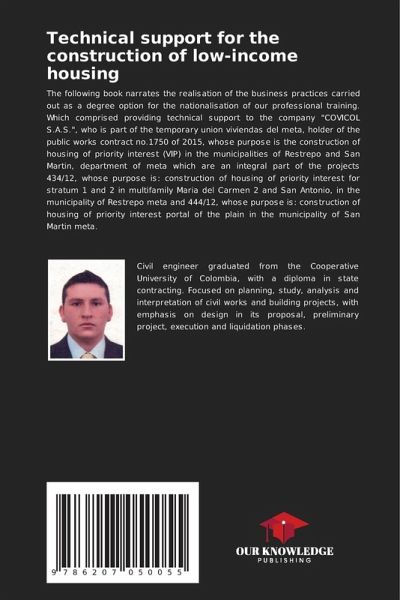 The following book narrates the realisation of the business practices carried out as a degree option for the nationalisation of our professional training. Which comprised providing technical support to the company "COVICOL S.A.S.", who is part of the temporary union viviendas del meta, holder of the public works contract no.1750 of 2015, whose purpose is the construction of housing of priority interest (VIP) in the municipalities of Restrepo and San Martin, department of meta which are an integral part of the projects 434/12, whose purpose is: construction of housing of priority interest for stratum 1 and 2 in multifamily Maria del Carmen 2 and San Antonio, in the municipality of Restrepo meta and 444/12, whose purpose is: construction of housing of priority interest portal of the plain in the municipality of San Martin meta.