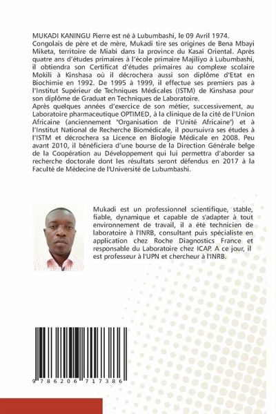 MUKADI KANINGU Pierre est né à Lubumbashi, le 09 Avril 1974. Congolais de père et de mère, Mukadi tire ses origines de Bena Mbayi Miketa, territoire de Miabi dans la province du Kasaï Oriental. Après quatre ans d'études primaires à l'école primaire Majiliyo à Lubumbashi, il obtiendra son Certificat d'études primaires au complexe scolaire Mokili à Kinshasa où il décrochera aussi son diplôme d'Etat en Biochimie en 1992. De 1995 à 1999, il effectue ses premiers pas à l'Institut Supérieur de Techniques Médicales (ISTM) de Kinshasa pour son diplôme de Graduat en Techniques de Laboratoire. Après quelques années d'exercice de son métier, successivement, au Laboratoire pharmaceutique OPTIMED, à la clinique de la cité de l'Union Africaine (anciennement "Organisation de l'Unité Africaine") et à l'Institut National de Recherche Biomédicale, il poursuivra ses études à l'ISTM et décrochera sa Licence en Biologie Médicale en 2008. Peu avant 2010, il bénéficiera d'une bourse de la Direction Générale belge de la Coopération au Développement qui lui permettra d'aborder sa recherche doctorale dont les résultats seront défendus en 2017 à la Faculté de Médecine de l'Université de Lubumbashi.