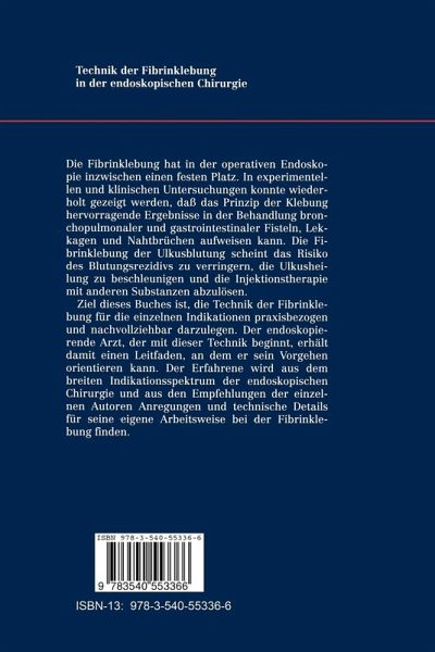 I. Grundlagen.- Wirkprinzip der Fibrinklebung.- Zur Infektionssieherheit des Fibrinklebers Tissucol.- II. Fisteltherapie.- A. Bronchopulmonale Fisteln.- Endoskopischer Verschluß infizierter Bronchusstumpffisteln nach Lungenresektionen mit der Fibrinklebung. Experimentelle und klinische Ergebnisse.- Endoskopischer Verschluß von peripheren Lungenfisteln.- Technik der Fibrinklebung beim endoskopischen Verschluß von peripheren Lungenparenchymfisteln.- B. Gastrointestinale Fisteln.- Ösophagotracheale Rezidivfisteln und angeborene isolierte ösophagotracheale Fisteln (H-Fisteln).- Endoskopische Verklebung tracheoösophagealer Fisteln und Rezidivfisteln im Säuglingsalter.- Ösophagotracheale und ösophagomediastinale Fisteln nach endoskopischen Eingriffen.- Endoskopische Fibrinklebung bei Gallefisteln.- Endoskopische Applikation von Fibrinkleber zur Behandlung von Anastomoseninsuffizienzen, Perforationen und Fisteln im Gastrointestinaltrakt.- Nahtinsuffizienz nach operativen Eingriffen an Kolon und Rektum.- Endoskopische Fibrinklebung zur Behandlung von Fisteln bei Morbus Crohn.- Periproktitische Fisteln.- III. Blutstillungsverfahren.- A. Verfahren bei peptischen Ulzera.- Klinische Ergebnisse der Injektionsmethode.- Injektionsmethoden. Klinische Ergebnisse einer prospektiv-randomisierten Studie in Freiburg.- Fibrinkleberinjektion zur endoskopischen Blutstillung: Klinische Aspekte beim peptischen Ulkus.- Fibrinklebung bei blutenden Magen- und Duodenalulzera.- Randomisierte Vergleichsuntersuchung: Polidocanol vs. Fibrinkleber. Aktuelle Ergebnisse bei schwerer Ulkusblutung.- B. Verfahren bei Varizen.- Endoskopische Fundusvarizenblockade.- IV. Fibrinklebung im Rahmen der laparoskopischen Chirurgie.- Fibrinklebung bei laparoskopischer Cholezystektomie.- LaserchirurgischeResektion einer Hydatidenzyste der Leber unter Videolaparoskopie.- Technik der Fibrinklebung in der endoskopischen Chirurgie.- V. Thorakoskopie.- Anwendung des Fibrinklebers bei der Pleurodese und bei Parenchymfisteln.