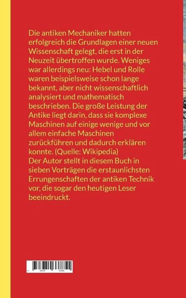 Die antiken Mechaniker hatten erfolgreich die Grundlagen einer neuen Wissenschaft gelegt, die erst in der Neuzeit übertroffen wurde. Weniges war allerdings neu: Hebel und Rolle waren beispielsweise schon lange bekannt, aber nicht wissenschaftlich analysiert und mathematisch beschrieben. Die große Leistung der Antike liegt darin, dass sie komplexe Maschinen auf einige wenige und vor allem einfache Maschinen zurückführen und dadurch erklären konnte. (Quelle: Wikipedia)Der Autor stellt in diesem Buch in sieben Vorträgen die erstaunlichsten Errungenschaften der antiken Technik vor, die sogar den heutigen Leser beeindruckt.