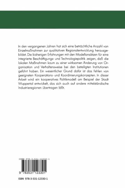 In den vergangenen Jahren hat sich eine beträchtliche Anzahl von Einzelmaßnahmen zur qualitativen Regionalentwicklung herausgebildet. Die bisherigen Erfahrungen mit den Modellansätzen für eine integrierte Beschäftigungs- und Technologiepolitik zeigen, daß die lokalen Maßnahmen kaum zu einer wirksamen Änderung von Organisation und Verhaltensweise bei den beteiligten Institutionen geführt haben. Ein wesentlicher Grund dafür ist das Fehlen von geeigneten Kooperations- und Koordinierungskonzepten. In dieser Arbeit wird ein kooperatives Politikmodell am Beispiel der Stadt Wuppertal entwickelt, das sich auch auf andere mittelständische Industrieregionen übertragen läßt.