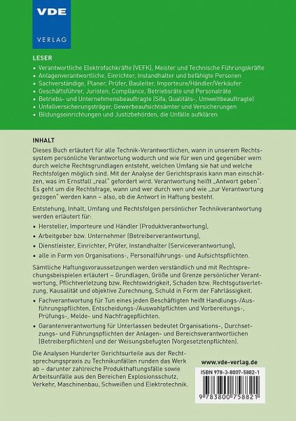 Dieses Buch erläutert für alle Technik-Verantwortlichen, wann in unserem Rechtssystem persönliche Verantwortung wodurch und wie für wen und gegenüber wem durch welche Rechtsgrundlagen entsteht, welchen Umfang sie hat und welche Rechtsfolgen möglich sind. Mit der Analyse der Gerichtspraxis kann man einschätzen, was im Ernstfall "real" gefordert wird. Verantwortung heißt "Antwort geben". Es geht um die Rechtsfrage, wann und wer durch wen und wie "zur Verantwortung gezogen" werden kann - also, ob die Antwort in Haftung besteht.Entstehung, Inhalt, Umfang und Rechtsfolgen persönlicher Technikverantwortung werden erläutert für:- Hersteller, Importeure und Händler (Produktverantwortung),- Arbeitgeber bzw. Unternehmer (Betreiberverantwortung),- Dienstleister, Einrichter, Prüfer, Instandhalter (Serviceverantwortung),- alle in Form von Organisations-, Personalführungs- und Aufsichtspflichten.Sämtliche Haftungsvoraussetzungen werden verständlich und mit Rechtsprechungsbeispielen erläutert -Grundlagen, Größe und Grenze persönlicher Verantwortung, Pflichtverletzung bzw. Rechtswidrigkeit, Schaden bzw. Rechtsgutsverletzung, Kausalität und objektive Zurechnung, Schuld in Form der Fahrlässigkeit.- Fachverantwortung für Tun eines jeden Beschäftigten heißt Handlungs-/Ausführungspflichten, Entscheidungs-/Auswahlpflichten und Vorbereitungs-, Prüfungs-, Melde- und Nachfragepflichten.- Garantenverantwortung für Unterlassen bedeutet Organisations-, Durchsetzungs- und Führungspflichten der Anlagen- und Bereichsverantwortlichen (Betreiberpflichten) und der Weisungsbefugten (Vorgesetztenpflichten).Die Analysen Hunderter Gerichtsurteile aus der Rechtsprechungspraxis zu Technikunfällen runden das Werk ab - darunter zahlreiche Produkthaftungsfälle sowie Arbeitsunfälle aus den Bereichen Explosionsschutz, Verkehr, Maschinenbau, Schweißen und Elektrotechnik.