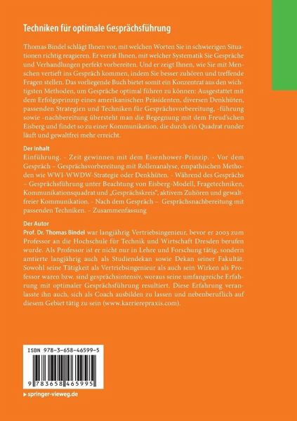 Thomas Bindel schlägt Ihnen vor, mit welchen Worten Sie in schwierigen Situationen richtig reagieren. Er verrät Ihnen, mit welcher Systematik Sie Gespräche und Verhandlungen perfekt vorbereiten. Und er zeigt Ihnen, wie Sie mit Menschen vertieft ins Gespräch kommen, indem Sie besser zuhören und treffende Fragen stellen. Das vorliegende Buch bietet somit ein Konzentrat aus den wichtigsten Methoden, um Gespräche optimal führen zu können: Ausgestattet mit dem Erfolgsprinzip eines amerikanischen Präsidenten, diversen Denkhüten, passenden Strategien und Techniken für Gesprächsvorbereitung, -führung sowie -nachbereitung übersteht man die Begegnung mit dem Freud schen Eisberg und findet so zu einer Kommunikation, die durch ein Quadrat runder läuft und gewaltfrei mehr erreicht.