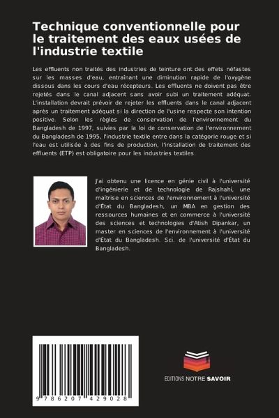 Les effluents non traités des industries de teinture ont des effets néfastes sur les masses d'eau, entraînant une diminution rapide de l'oxygène dissous dans les cours d'eau récepteurs. Les effluents ne doivent pas être rejetés dans le canal adjacent sans avoir subi un traitement adéquat. L'installation devrait prévoir de rejeter les effluents dans le canal adjacent après un traitement adéquat si la direction de l'usine respecte son intention positive. Selon les règles de conservation de l'environnement du Bangladesh de 1997, suivies par la loi de conservation de l'environnement du Bangladesh de 1995, l'industrie textile entre dans la catégorie rouge et si l'eau est utilisée à des fins de production, l'installation de traitement des effluents (ETP) est obligatoire pour les industries textiles.