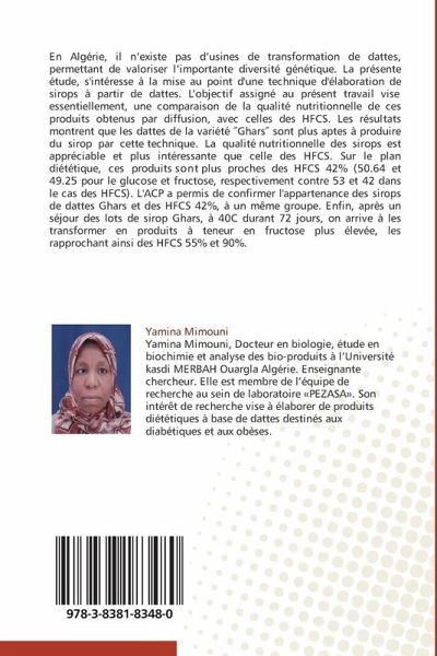 En Algérie, il n existe pas d usines de transformation de dattes, permettant de valoriser l importante diversité génétique. La présente étude, s'intéresse à la mise au point d'une technique d'élaboration de sirops à partir de dattes. L objectif assigné au présent travail vise essentiellement, une comparaison de la qualité nutritionnelle de ces produits obtenus par diffusion, avec celles des HFCS. Les résultats montrent que les dattes de la variété Ghars sont plus aptes à produire du sirop par cette technique. La qualité nutritionnelle des sirops est appréciable et plus intéressante que celle des HFCS. Sur le plan diététique, ces produits sont plus proches des HFCS 42% (50.64 et 49.25 pour le glucose et fructose, respectivement contre 53 et 42 dans le cas des HFCS). L'ACP a permis de confirmer l'appartenance des sirops de dattes Ghars et des HFCS 42%, à un même groupe. Enfin, après un séjour des lots de sirop Ghars, à 40C durant 72 jours, on arrive à les transformer en produits à teneur en fructose plus élevée, les rapprochant ainsi des HFCS 55% et 90%.