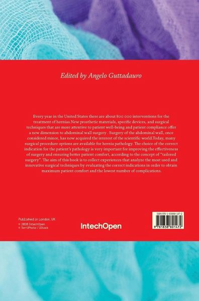Every year in the United States there are about 800 000 interventions for the treatment of hernias.New prosthetic materials, specific devices, and surgical techniques that are more attentive to patient well-being and patient compliance offer a new dimension to abdominal wall surgery . Surgery of the abdominal wall, once considered minor, has now acquired the interest of the scientific world.Today, many surgical procedure options are available for hernia pathology. The choice of the correct indication for the patient¿s pathology is very important for improving the effectiveness of surgery and ensuring better patient comfort, according to the concept of ¿tailored surgery¿. The aim of this book is to collect experiences that analyze the most used and innovative surgical techniques by evaluating the correct indications in order to obtain maximum patient comfort and the lowest number of complications.