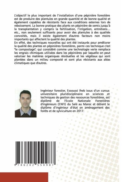 L'objectif le plus important de l'installation d'une pépinière forestière est de produire des plantules en grande quantité et de bonne qualité et également capables de résistants face aux conditions externes lors de reboisement. La bonne pratique des plants en pépinière de semis jusqu'à la transplantation y compris la fertilisation, l'irrigation, entretiens... etc., non seulement suffisants pour avoir des plantules à des qualités convoités, mais il existe également d'autres facteurs non moins importants qui affectent la qualité des plantes.En effet, des techniques nouvelles qui ont été instaurés pour améliorer la qualité des plantes en pépinières forestières, parmi ces technique c'est "le compostage"; qui considéré comme une technologie verte remplace les engrais chimiques utilisées dans les pépinières par laquelle on peut valoriser les matières organiques résiduelles et les végétaux qui sont plantées dans un milieu composté et sont plus résistants aux aléas climatiques que d'autres.