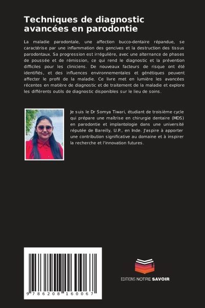 La maladie parodontale, une affection bucco-dentaire répandue, se caractérise par une inflammation des gencives et la destruction des tissus parodontaux. Sa progression est irrégulière, avec une alternance de phases de poussée et de rémission, ce qui rend le diagnostic et la prévention difficiles pour les cliniciens. De nouveaux facteurs de risque ont été identifiés, et des influences environnementales et génétiques peuvent affecter le profil de la maladie. Ce livre met en lumière les avancées récentes en matière de diagnostic et de traitement de la maladie et explore les différents outils de diagnostic disponibles sur le lieu de soins.
