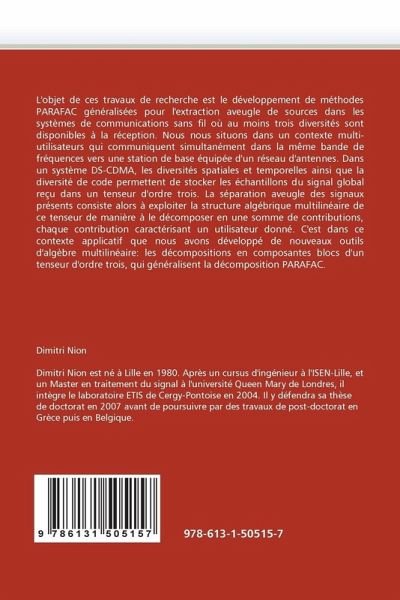 L''objet de ces travaux de recherche est le développement de méthodes PARAFAC généralisées pour l''extraction aveugle de sources dans les systèmes de communications sans fil où au moins trois diversités sont disponibles à la réception. Nous nous situons dans un contexte multi-utilisateurs qui communiquent simultanément dans la même bande de fréquences vers une station de base équipée d''un réseau d''antennes. Dans un système DS-CDMA, les diversités spatiales et temporelles ainsi que la diversité de code permettent de stocker les échantillons du signal global reçu dans un tenseur d''ordre trois. La séparation aveugle des signaux présents consiste alors à exploiter la structure algébrique multilinéaire de ce tenseur de manière à le décomposer en une somme de contributions, chaque contribution caractérisant un utilisateur donné. C''est dans ce contexte applicatif que nous avons développé de nouveaux outils d''algèbre multilinéaire: les décompositions en composantes blocs d''un tenseur d''ordre trois, qui généralisent la décomposition PARAFAC.