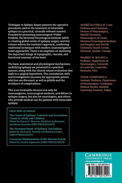 Techniques in Epilepsy Surgery presents the operative procedures used in the treatment of intractable epilepsy in a practical, clinically relevant manner. Founded by pioneering neurosurgeon Wilder Penfield, the Montreal Neurological Institute (MNI) is a leading global centre of epilepsy surgery and this volume reflects the Institute's approach, combining traditional techniques with modern neuronavigation-based approaches. There is an emphasis on mastering the important trilogy of topographic, vascular and functional anatomy of the brain. The basic anatomical and physiological mechanisms underlying epilepsy are presented in a practical manner, along with the clinical seizure evaluation that leads to a surgical hypothesis. The consultation skills and investigations necessary for appropriate patient selection are discussed, as well as pitfalls and the avoidance of complications. This is an invaluable resource not only for neurosurgeons, neurosurgical residents and fellows in epilepsy surgery, but also for neurologists, and others who provide medical care for patients with intractable epilepsy.