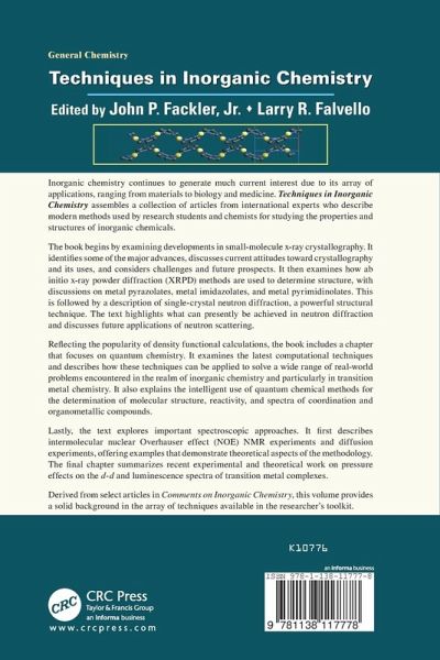 A collection of articles from international experts, this volume examines modern methods used for studying the properties and structures of inorganic compounds. The book begins by examining developments in small-molecule x-ray crystallography. This is followed by a description of single crystal neutron diffraction, a chapter on quantum chemistry, and an exploration of two important spectroscopic techniques. It describes intermolecular nuclear Overhauser effect (NOE), NMR experiments and diffusion experiments for elucidating supramolecular structure--offering examples that demonstrate theoretical aspects of the methodology. The final chapter summarizes recent experimental and theoretical work on pressure effects on the d-d and luminescence spectra of transition metal complexes.