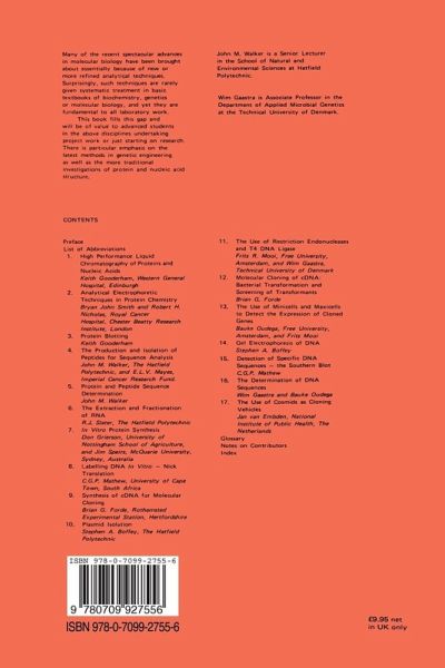 The last few years have seen the rapid development of new methodology in the field of molecular biology. New techniques have been regularly introduced and the sensitivity of older techniques greatly improved upon. Developments in the field of genetic engineering in particular have contributed a wide range of new techniques. The purpose of this book therefore is to introduce the reader to a selection of the more advanced analytical and preparative techniques which the editors consider to be frequently used by research workers in the field of molecular biology. In choosing techniques for this book we have obviously had to be selective, and for the sake of brevity a knowledge of certain basic biochemical techniques and terminology has been assumed. However, since many areas of molecular biology are developing at a formidable rate and constantly generating new terminology, a glossary of terms has been included. The techniques chosen for this book are essentially based on those used in a series of workshops on 'techniques in molecular biology' that have been held at The Hatfield Polytechnic in recent years. In choosing these chapters we have taken into account many useful suggestions and observations made by participants at these workshops. Each chapter aims to describe both the theory and relevant practical details for a given technique, and to identify both the potential and limitations of the technique. Each chapter is written by authors who regularly use the technique in their own laboratories.