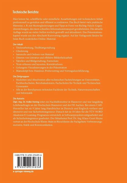 Technische Berichte enthält die Beschreibung aller wichtigen notwendigen Kenntnisse und Fertigkeiten, um schriftliche oder mündliche Ausarbeitungen mit technischem Inhalt professionell zu gestalten. Das Buch bietet neben der Beantwortung der regelmäßig auftauchenden Fragen nach der formalen Gestaltung auch praktische Hinweise, z.B. mit Mustergliederungen und Tipps in Form von Richtig-Falsch-Gegenüberstellungen.