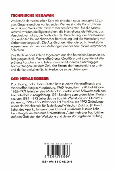 Konstruktionskeramik und Werkstoffe mit keramischen Schichten stehen im Mittelpunkt des Buches. Die Eigenschaften der Massivkeramik, ihre Herstellung, Prüfung, das Verschleißverhalten, Berechnungsmethoden, Konstruktion und die Herstellung von Verbunden werden ebenso behandelt wie das Aufbringen keramischer Schichten.