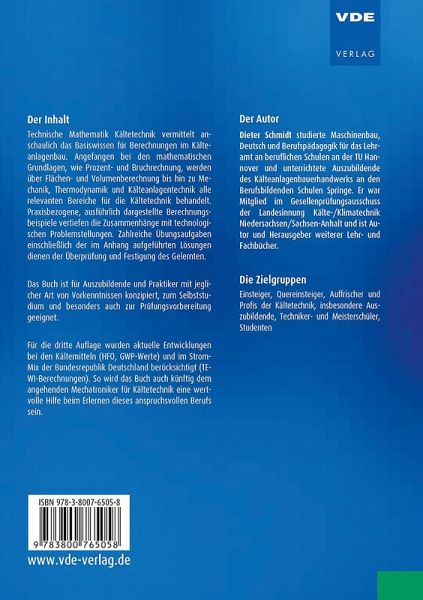 Technische Mathematik Kältetechnik vermittelt anschaulich das Basiswissen für Berechnungen im Kälteanlagenbau. Angefangen bei den mathematischen Grundlagen, wie Prozent- und Bruchrechnung, werden über Flächen- und Volumenberechnung bis hin zu Mechanik, Thermodynamik und Kälteanlagentechnik alle relevanten Bereiche für die Kältetechnik behandelt. Praxisbezogene, ausführlich dargestellte Berechnungsbeispiele vertiefen die Zusammenhänge mit technologischen Problemstellungen. Zahlreiche Übungsaufgaben einschließlich der im Anhang aufgeführten Lösungen dienen der Überprüfung und Festigung des Gelernten.Das Buch ist für Auszubildende und Praktiker mit jeglicher Art von Vorkenntnissen konzipiert, zum Selbststudium und besonders auch zur Prüfungsvorbereitung geeignet.Für die dritte Auflage wurden aktuelle Entwicklungen bei den Kältemitteln (HFO, GWP-Werte) und im Strom-Mix der Bundesrepublik Deutschland berücksichtigt (TEWI-Berechnungen). So wird das Buch auch künftig dem angehenden Mechatroniker für Kältetechnik eine wertvolle Hilfe beim Erlernen dieses anspruchsvollen Berufs sein.
