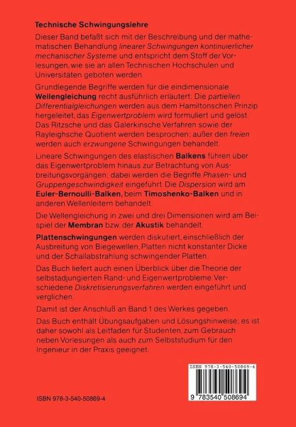 Dieser Band befaßt sich mit der Beschreibung und der mathematischen Behandlung der linearen Schwingungen kontinuierlicher mechanischer Systeme und entspricht dem Stoff von Vorlesungen, wie sie an Technischen Hochschulen und Universitäten für Studenten technischer Fachrichtungen, aber auch für Physiker, angewandte Mathematiker und Informatiker angeboten werden. Grundlegende Begriffe werden recht ausführlich für die eindimensionale Wellengleichung erläutert. Partielle Differentialgleichungen werden hergeleitet, das Eigenwertproblem wird formuliert und gelöst. Auch das Ritzsche und das Galerkinsche Verfahren, sowie der Rayleighsche Quotient werden besprochen, wobei außer den freien auch erzwungene Schwingungen behandelt werden. Diskutiert werden die d'Alembertsche Lösung der Wellengleichung, Reflexionen am festen und am freien Ende, Zwangserregung am Rande und der Energietransport. Bei den linearen Schwingungen elastischer Balken werden zusätzlich zum Eigenwertproblem die Ausbreitungsvorgänge betrachtet. Die Begriffe Phasen- und Gruppengeschwindigkeit werden eingeführt und die Dispersion wird behandelt. Die Wellengleichung in zwei und drei Dimensionen wird am Beispiel der Membran bzw. der Akustik diskutiert. Auch hier werden Reflexion, Brechung sowie Ausbreitungsvorgänge untersucht, wobei Kugel-, Zylinder- und Rohrwellen behandelt werden. Plattenschwingungen werden besprochen, einschließlich der Ausbreitung von Biegewellen in Platten, der Platten nichtkonstanter Dicke und der Schallabstrahlung von schwingenden Platten. Es wird ein Überblick über die Theorie der Rand- und Eigenwertprobleme der linearen Schwingungen mechanischer Kontinua gegeben. Diskretisierungsverfahren werden eingeführt und miteinander verglichen. Damit ist dann der Anschluß an Band 1 gegeben, in dem lineare diskrete mechanische Systeme behandelt wurden. Das Buch enthält Übungsaufgaben und Lösungshinweise; es ist daher sowohl als Leitfaden für Studenten, wie auch zumSelbststudium für den Ingenieur in der Praxis geeignet.