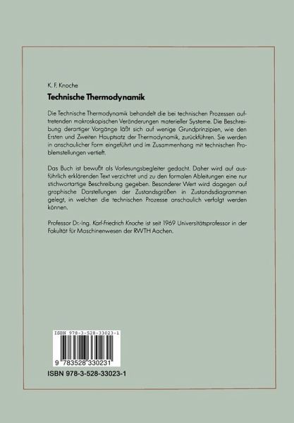 Inhaltsverzeichniss.- 1. Grundbegriffe.- 1.1 Thermodynamisches System.- 1.2 Zustand und Zustandsgrößen; Prozeß.- 1.3 Natürliche Vorgänge und Gleichgewicht; Temperatur.- 1.4 Nullter Hauptsatz.- 1.5 Temperaturfixpunkte und empirische Temperaturskala.- 1.6 Thermische Zustandsgieichung idealer Gase.- 2. Erster Hauptsatz der Tliermodynamik.- 2.1 Volumenänderungsarbeit.- 2.2 Innere Energie.- 2.3 Erster Hauptsatz für geschlossene Systeme.- 2.4 Innere Energie idealer Gase.- 2.5 Spezifische Wärmekapazität.- 3. Zustandsänderungen.- 3.1 Quasistatische und nichtstatische Zustandsänderungen.- 3.2 Quasistatische Zustandsänderungen.- 4. Kreisprozesse.- 4.1 Otto-Prozeß.- 4.2 Rechtslaufender Carnot-Prozeß.- 4.3 Linkslaufender Carnot-Prozeß.- 4.4 Rechtslaufende und linkslaufende Kreisprozesse.- 5. Zweiter Hauptsatz der Thermodynamik.- 5.1 Umkehrbare und nichtumkehrbare Prozesse.- 5.2 Umkehrbare Kreisprozesse.- 5.3 Absolute Temperatur.- 5.4 Nichtumkehrbare Kreisprozesse.- 5.5 Clausiussche Ungleichung.- 5.6 Entropie.- 5.7 Arbeitsleistung und Nichtumkehrbarkeit.- 5.8 Entropieänderung idealer Gase.- 5.9 T,s-Diagramm für einfache Stoffe.- 6. Offene Systeme.- 6.1 Drucklufterzeugung (Gleichdruckprozeß).- 6.2 Stationärer Fließprozeß.- 6.3 Erster und Zweiter Hauptsatz für offene Systeme.- 7. Das Wesen der Entropie.- 7.1 Statistische Deutung des adiabaten Druckausgleichs.- 7.2 Statistische Enegieverteilung.- 7.3 Wahrscheinlichkeit und Entropie.- 8. Reale Gase und Dämpfe.- 8.1 Der Verdampfungsvorgang.- 8.2 Zustandsänderungen des Naßdampfes.- 8.3 Clapeyron-Clausius-Gleichung.- 8.4 Zustandsgieichung nach van der Waals.- 8.5 Weitere Zustandsgieichungen.- 8.6 Kalorische Zustandsgrößen.- 8.7 Zweiphasengebiete.- 9. Wärmekraftprozesse.- 9.1 Mittlere Temperatur desWärmeumsatzes.- 9.2 Dampfkraftprozeß.- 9.3 Dampf kr aftprozeß im Mollier h,s-Diagramm.- 9.4 Gasturbinenprozesse.- 10 Exergie.- 10.1 Exergie eines Fremdstoffs mit der Umgebung.- 10.2 Mollier-h,s-Diagramm und Exergie.- 11 Strömungsvorgänge.- 11.1 Kontinuitätsgleichung.- 11.2 Energieumsatz; Erster Hauptsatz.- 11.3 Polytrope Zustandsänderungen.- 11.4 Adiabate Strömungsprozesse.- 11.5 Prinzip des Strahltriebwerkes.- 12 Grundlagen der Kältetechnik.- 12.1 Kältemaschinen und Kältetechnik.- 12.2 Grundlagen der Gasverflüssigung.- 13 Gemische und Mischungsprozesse.- 13.1 Gemische.- 13.2 Adiabate Mischung idealer Gase.- 13.3 Feuchte Luft.- 14 Verbrennungsvorgänge und andere chemische Umsetzungen.- 14.1 Stoffumsatz.- 14.2 Feste und flüssige Brennstoffe.- 14.3 Energiebilanz.- 14.4 Entropiebilanz und Irreversibilsitäten der Verbrennung.- Literatur.- Sachwortverzeichnis.