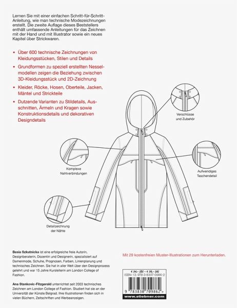 Exakte Modezeichnungen sind die unverzichtbare Grundlage für die schneiderische Umsetzung. Klar und anschaulich vermittelt dieser Band deshalb auch die Erstellung dieser technischen Darstellungen: Hierfür werden Fotografien von grundlegenden Schnitten und designerische Details immer den zugehörigen Zeichnungen gegenübergestellt, so dass auf den ersten Blick erkennbar ist, wie eigene Entwürfe anzulegen sind und worauf es bei der Übertragung von der dreidimensionalen Idee in eine zweidimensionale Vorlage eigentlich ankommt. Die zweite Auflage dieses erweiterten Bestsellers enthält umfassende Anleitungen für das Zeichnen mit der Hand und mit Illustrator sowie ein neues Kapitel über Strickwaren. _ Über 600 technische Zeichnungen von Kleidungsstücken, Stilen und Details. _ Grundformen zu speziell erstellten Nesselmodellen zeigen die Beziehung zwischen 3D-Kleidungsstück und 2D-Zeichnung. _ Dutzende Varianten zu Stildetails, Ausschnitten, Ärmeln und Kragen sowie Konstruktionsdetails unddekorativen Designdetails. Mit 29 kostenfreien Muster-Illustrationen zum Herunterladen.