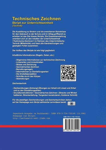 Die Ausbildung zu fördern und die erworbenen Kenntnisse für den Gebrauch in der Schule und im Alltag griffbereit zu erhalten ist das Ziel dieses Skripts. Die Zusammenstellung orientiert sich an den Inhalten der Unterrichtseinheit >Technisches Zeichnen< im Rahmen des Unterrichtsfachs Technik (Mittelstufe) und fasst alle Handreichungen und gezeigten Folien zusammen.Der Aufbau des Skripts ist gegliedert wie folgt:Inhaltliche Informationen (Regeln, Daten, etc.) - Allgemeine Informationen zur technischen Zeichnung - Linienarten und Linienbreiten - Skizze und Zeichnung - Geometrisches Zeichnen - Bemaßungsregeln - Informationen zu Darstellungsarten - Die Dreitafelprojektion - Schnitte durch den Körper - AbwicklungenZeichentechnik- Zeichenübungen [Anhang] (Übungen zur Arbeit mit Lineal und Zirkel und zu den Darstellungsarten)- Grundkonstruktionen / Geometrisches Zeichnen (Strecke und Winkel halbieren, Streckenteilung, Tangenten konstruieren, Goldener Schnitt)