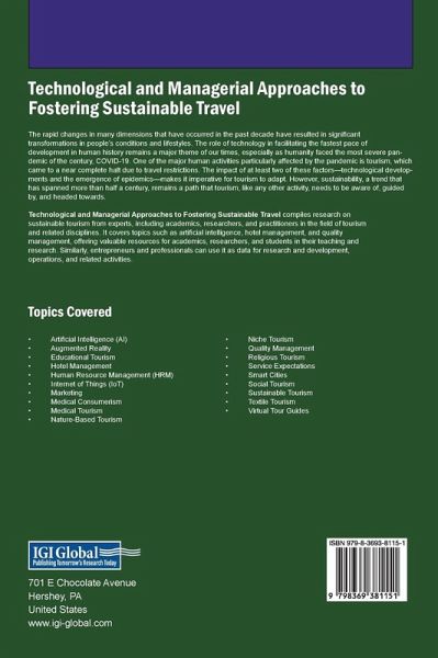 The rapid changes in many dimensions that have occurred in the past decade have resulted in significant transformations in people's conditions and lifestyles. The role of technology in facilitating the fastest pace of development in human history remains a major theme of our times, especially as humanity faced the most severe pandemic of the century, COVID-19. One of the major human activities particularly affected by the pandemic is tourism, which came to a near complete halt due to travel restrictions. The impact of at least two of these factors-technological developments and the emergence of epidemics-makes it imperative for tourism to adapt. However, sustainability, a trend that has spanned more than half a century, remains a path that tourism, like any other activity, needs to be aware of, guided by, and headed towards. Technological and Managerial Approaches to Fostering Sustainable Travel compiles research on sustainable tourism from experts, including academics, researchers, and practitioners in the field of tourism and related disciplines. It covers topics such as artificial intelligence, hotel management, and quality management, offering valuable resources for academics, researchers, and students in their teaching and research. Similarly, entrepreneurs and professionals can use it as data for research and development, operations, and related activities.