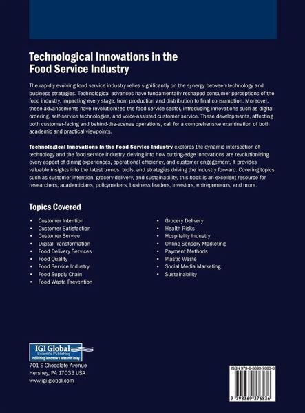 The rapidly evolving food service industry relies significantly on the synergy between technology and business strategies. Technological advances have fundamentally reshaped consumer perceptions of the food industry, impacting every stage, from production and distribution to final consumption. Moreover, these advancements have revolutionized the food service sector, introducing innovations such as digital ordering, self-service technologies, and voice-assisted customer service. These developments, affecting both customer-facing and behind-the-scenes operations, call for a comprehensive examination of both academic and practical viewpoints. Technological Innovations in the Food Service Industry explores the dynamic intersection of technology and the food service industry, delving into how cutting-edge innovations are revolutionizing every aspect of dining experiences, operational efficiency, and customer engagement. It provides valuable insights into the latest trends, tools, and strategies driving the industry forward. Covering topics such as customer intention, grocery delivery, and sustainability, this book is an excellent resource for researchers, academicians, policymakers, business leaders, investors, entrepreneurs, and more.