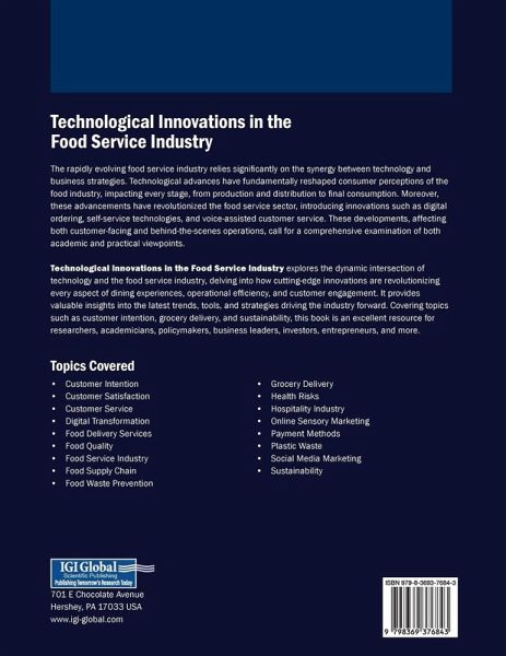 The rapidly evolving food service industry relies significantly on the synergy between technology and business strategies. Technological advances have fundamentally reshaped consumer perceptions of the food industry, impacting every stage, from production and distribution to final consumption. Moreover, these advancements have revolutionized the food service sector, introducing innovations such as digital ordering, self-service technologies, and voice-assisted customer service. These developments, affecting both customer-facing and behind-the-scenes operations, call for a comprehensive examination of both academic and practical viewpoints. Technological Innovations in the Food Service Industry explores the dynamic intersection of technology and the food service industry, delving into how cutting-edge innovations are revolutionizing every aspect of dining experiences, operational efficiency, and customer engagement. It provides valuable insights into the latest trends, tools, and strategies driving the industry forward. Covering topics such as customer intention, grocery delivery, and sustainability, this book is an excellent resource for researchers, academicians, policymakers, business leaders, investors, entrepreneurs, and more.