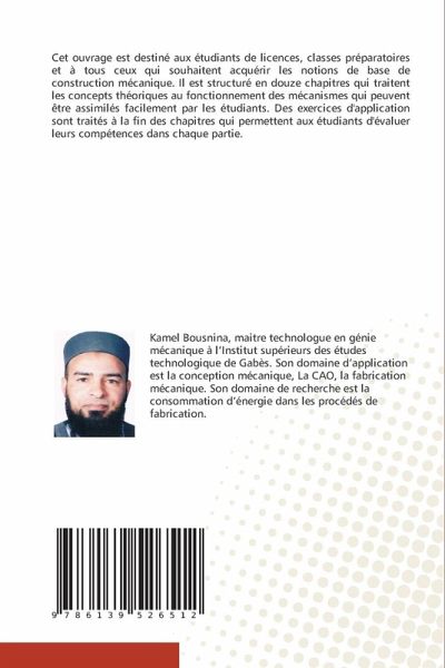 Cet ouvrage est destiné aux étudiants de licences, classes préparatoires et à tous ceux qui souhaitent acquérir les notions de base de construction mécanique. Il est structuré en douze chapitres qui traitent les concepts théoriques au fonctionnement des mécanismes qui peuvent être assimilés facilement par les étudiants. Des exercices d'application sont traités à la fin des chapitres qui permettent aux étudiants d'évaluer leurs compétences dans chaque partie.