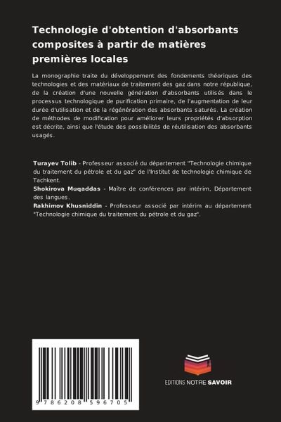 La monographie traite du développement des fondements théoriques des technologies et des matériaux de traitement des gaz dans notre république, de la création d'une nouvelle génération d'absorbants utilisés dans le processus technologique de purification primaire, de l'augmentation de leur durée d'utilisation et de la régénération des absorbants saturés. La création de méthodes de modification pour améliorer leurs propriétés d'absorption est décrite, ainsi que l'étude des possibilités de réutilisation des absorbants usagés.