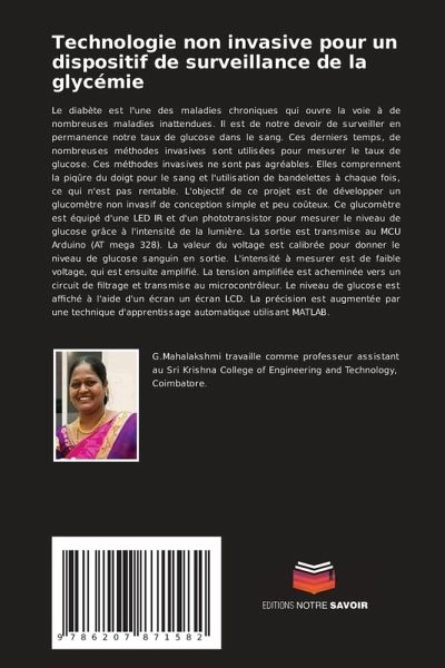 Le diabète est l'une des maladies chroniques qui ouvre la voie à de nombreuses maladies inattendues. Il est de notre devoir de surveiller en permanence notre taux de glucose dans le sang. Ces derniers temps, de nombreuses méthodes invasives sont utilisées pour mesurer le taux de glucose. Ces méthodes invasives ne sont pas agréables. Elles comprennent la piqûre du doigt pour le sang et l'utilisation de bandelettes à chaque fois, ce qui n'est pas rentable. L'objectif de ce projet est de développer un glucomètre non invasif de conception simple et peu coûteux. Ce glucomètre est équipé d'une LED IR et d'un phototransistor pour mesurer le niveau de glucose grâce à l'intensité de la lumière. La sortie est transmise au MCU Arduino (AT mega 328). La valeur du voltage est calibrée pour donner le niveau de glucose sanguin en sortie. L'intensité à mesurer est de faible voltage, qui est ensuite amplifié. La tension amplifiée est acheminée vers un circuit de filtrage et transmise au microcontrôleur. Le niveau de glucose est affiché à l'aide d'un écran un écran LCD. La précision est augmentée par une technique d'apprentissage automatique utilisant MATLAB.