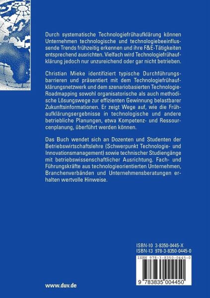 Christian Mieke identifiziert typische Durchführungsbarrieren und präsentiert mit dem Technologiefrühaufklärungsnetzwerk und dem szenariobasierten Technologie-Roadmapping sowohl organisatorische als auch methodische Lösungswege zur effizienten Gewinnung belastbarer Zukunftsinformationen. Er zeigt Wege auf, wie die Frühaufklärungsergebnisse in technologische und andere betriebliche Planungen, etwa Kompetenz- und Ressourcenplanung, überführt werden können.