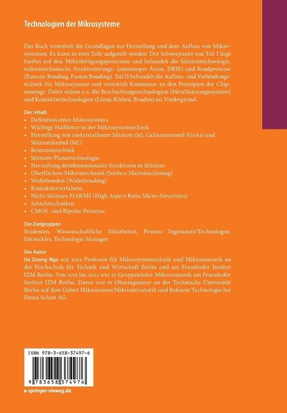 Das Buch vermittelt die Grundlagen zur Herstellung und dem Aufbau von Mikrosystemen. Es kann in zwei Teile aufgeteilt werden. Der Schwerpunkt von Teil I liegt hierbei auf den Mikrofertigungsprozessen und behandelt die Siliziumtechnologie, mikromechanische Strukturierungs- (anisotropes Ätzen, DRIE) und Bondprozesse (Eutectic Bonding, Fusion Bonding). Teil II behandelt die Aufbau- und Verbindungstechnik für Mikrosysteme und vermittelt Kenntnisse zu den Prinzipien der Chipmontage. Dabei stehen u.a. die Beschichtungstechnologien (Metallisierungssysteme) und Kontaktiertechnologien (Löten, Kleben, Bonden) im Vordergrund.