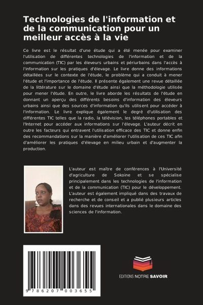 Ce livre est le résultat d'une étude qui a été menée pour examiner l'utilisation de différentes technologies de l'information et de la communication (TIC) par les éleveurs urbains et périurbains dans l'accès à l'information sur les pratiques d'élevage. Le livre donne des informations détaillées sur le contexte de l'étude, le problème qui a conduit à mener l'étude et l'importance de l'étude. Il présente également une revue détaillée de la littérature sur le domaine d'étude ainsi que la méthodologie utilisée pour mener l'étude. En outre, le livre aborde les résultats de l'étude en donnant un aperçu des différents besoins d'information des éleveurs urbains ainsi que des sources d'information qu'ils utilisent pour accéder à l'information. Le livre explique également le degré d'utilisation des différentes TIC telles que la radio, la télévision, les téléphones portables et l'Internet pour accéder aux informations sur l'élevage. L'auteur décrit en outre les facteurs qui entravent l'utilisation efficace des TIC et donne enfin des recommandations sur la manière d'améliorer l'utilisation de ces TIC afin d'améliorer les pratiques d'élevage en milieu urbain et d'augmenter la production.