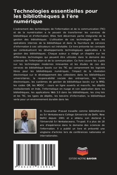 L'avènement des technologies de l'information et de la communication (TIC) et de la numérisation a le pouvoir de transformer les services de bibliothèque et d'information. Elles font désormais partie intégrante de la gestion des bibliothèques. L'utilisation de ces technologies dans les opérations internes de la bibliothèque et dans la fourniture de services d'information à ses utilisateurs est inévitable. Ce livre présente les concepts qui contextualisent les développements technologiques applicables à la gestion des bibliothèques. Chaque auteur a rédigé un chapitre sur les différentes technologies qui peuvent être utilisées dans le domaine des sciences de l'information et de la communication. Ce livre couvre les sujets sur les technologies modernes innovantes et les études de cas des services de bibliothèque basés sur les TIC qui comprennent les logiciels libres pour les bibliothèques numériques, l'impact de la révolution électronique sur le développement des collections dans les bibliothèques universitaires, la responsabilité sociale des entreprises, les livres électroniques, les systèmes de gestion de bibliothèque basés sur la RFID, les codes QR, les MOOC - cours en ligne ouverts et massifs, les dépôts institutionnels en Inde, l'informatique en nuage et son application dans les bibliothèques, les applications Web 3.0 dans les bibliothèques, les cinq lois et les TIC, les types de dépôts, les besoins d'information, la bibliothèque verte pour un environnement durable dans les