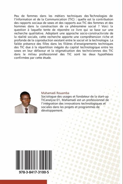 Peu de femmes dans les métiers techniques des Technologies de l'Information et de la Communication (TIC) : quelle est la contribution des rapports sociaux de sexes et des rapports aux TIC des femmes et des hommes dans la construction de ce phénomène social ? Voici la question à laquelle tente de répondre ce livre qui se base sur une recherche qualitative. Adoptant une approche socio-constructiviste de la réalité sociale, cette recherche apporte une compréhension riche et profonde de la coproduction existant entre le social et la technologie. La faible présence des filles dans les filières d'enseignements techniques des TIC due à la répartition inégale du capital technologique entre les sexes en leur défaveur et la stigmatisation des techniciennes des TIC dans le milieu professionnel des TIC sont les deux hypothèses confirmées par cette étude.