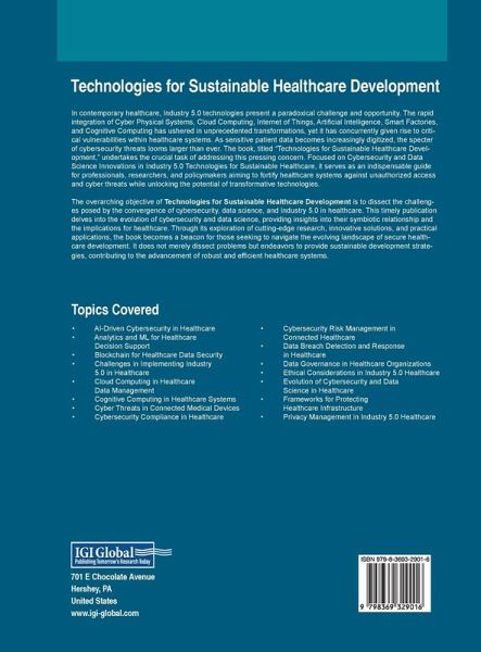 In contemporary healthcare, Industry 5.0 technologies present a paradoxical challenge and opportunity. The rapid integration of Cyber Physical Systems, Cloud Computing, Internet of Things, Artificial Intelligence, Smart Factories, and Cognitive Computing has ushered in unprecedented transformations, yet it has concurrently given rise to critical vulnerabilities within healthcare systems. As sensitive patient data becomes increasingly digitized, the specter of cybersecurity threats looms larger than ever. The book, titled "Technologies for Sustainable Healthcare Development," undertakes the crucial task of addressing this pressing concern. Focused on Cybersecurity and Data Science Innovations in Industry 5.0 Technologies for Sustainable Healthcare, it serves as an indispensable guide for professionals, researchers, and policymakers aiming to fortify healthcare systems against unauthorized access and cyber threats while unlocking the potential of transformative technologies. The overarching objective of Technologies for Sustainable Healthcare Development is to dissect the challenges posed by the convergence of cybersecurity, data science, and Industry 5.0 in healthcare. This timely publication delves into the evolution of cybersecurity and data science, providing insights into their symbiotic relationship and the implications for healthcare. Through its exploration of cutting-edge research, innovative solutions, and practical applications, the book becomes a beacon for those seeking to navigate the evolving landscape of secure healthcare development. It does not merely dissect problems but endeavors to provide sustainable development strategies, contributing to the advancement of robust and efficient healthcare systems.