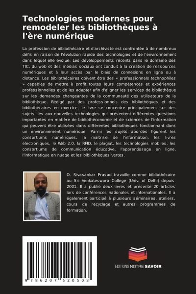 La profession de bibliothécaire et d'archiviste est confrontée à de nombreux défis en raison de l'évolution rapide des technologies et de l'environnement dans lequel elle évolue. Les développements récents dans le domaine des TIC, du web et des médias sociaux ont conduit à la création de ressources numériques et à leur accès par le biais de connexions en ligne ou à distance. Les bibliothécaires doivent être des « professionnels technophiles » capables de mettre à profit toutes leurs compétences et expériences professionnelles et de les adapter afin d'aligner les services de bibliothèque sur les demandes changeantes de la communauté des utilisateurs de la bibliothèque. Rédigé par des professionnels des bibliothèques et des bibliothécaires en exercice, le livre se concentre principalement sur des sujets liés aux nouvelles technologies qui présentent différentes questions importantes en matière de bibliothéconomie et de sciences de l'information qui peuvent être utilisées dans différentes bibliothèques fonctionnant dans un environnement numérique. Parmi les sujets abordés figurent les consortiums numériques, la maîtrise de l'information, les livres électroniques, le Web 2.0, la RFID, le plagiat, les technologies mobiles, les consortiums de communication éducative, l'apprentissage en ligne, l'informatique en nuage et les bibliothèques vertes.