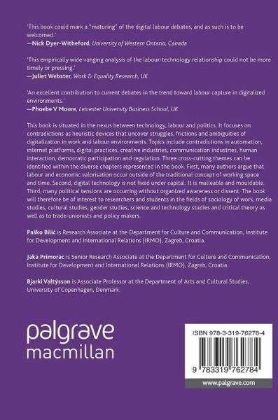 This book is situated in the nexus between technology, labour and politics. It focuses on contradictions as heuristic devices that uncover struggles, frictions and ambiguities of digitalization in work and labour environments. Topics include contradictions in automation, internet platforms, digital practices, creative industries, communication industries, human interaction, democratic participation and regulation. Three cross-cutting themes can be identified within the diverse chapters represented in the book. First, many authors argue that labour and economic valorisation occur outside of the traditional concept of working space and time. Second, digital technology is not fixed under capital. It is malleable and mouldable. Third, many political tensions are occurring without organized awareness or dissent. The book will, therefore, be of interest to researchers and students in the fields of sociology of work, media studies, cultural studies, gender studies, science and technology studies and Critical Theory as well as to trade-unionists and policy makers.