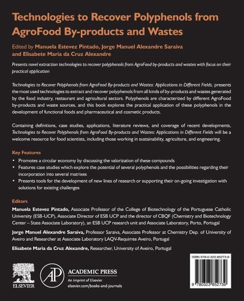 Technologies to Recover Polyphenols from AgroFood By-products and Wastes: Applications in Different Fields covers the most used technologies to extract and recover polyphenols from all kinds of by-products and wastes generated by the food industry, restaurant and agricultural sectors. Polyphenols are characterized by different AgroFood by-products and waste sources, hence this book explores the practical applications of these polyphenols in the development of functional foods and pharmaceutical and cosmetic products. Containing definitions, case studies, applications, literature reviews, and coverage of recent developments, this book will be a welcomed resource for food scientists, including those working in sustainability, agriculture and engineering.