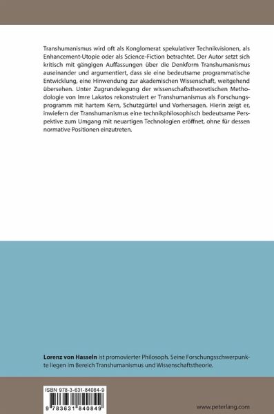 Transhumanismus wird oft als Konglomerat spekulativer Technikvisionen, als Enhancement-Utopie oder als Science-Fiction betrachtet. Der Autor setzt sich kritisch mit gängigen Auffassungen über die Denkform Transhumanismus auseinander und argumentiert, dass sie eine bedeutsame programmatische Entwicklung, eine Hinwendung zur akademischen Wissenschaft, weitgehend übersehen. Unter Zugrundelegung der wissenschaftstheoretischen Methodologie von Imre Lakatos rekonstruiert er Transhumanismus als Forschungsprogramm mit hartem Kern, Schutzgürtel und Vorhersagen. Hierin zeigt er, inwiefern der Transhumanismus eine technikphilosophisch bedeutsame Perspektive zum Umgang mit neuartigen Technologien eröffnet, ohne für dessen normative Positionen einzutreten.