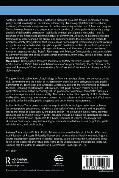 "Anthony Trotta has significantly elevated the discourse on a core tension in American public policy: expert knowledge vs. participatory democracy. Technological determinism-rational, unbiased, efficient-is widely assumed to be the overarching architecture of American progress. Trotta, however, broadens and deepens our understanding of public policy tensions via a deep analysis of deliberative democracy-politically oriented, participatory, discursive-that is grounded in an inherent and growing mistrust of government. As such, he presents a valuable framework for understanding the critical and enduring tensions that are enduring threats to American society along political fault lines such as: technological remediation of global warming vs. public resistance to lifestyle disruptions, public health interventions to confront pandemics vs. discomfort with vaccines and stringent shutdowns, and the value of government-issued money vs. cryptocurrencies. Trotta's Technology and American Democracy is a welcome addition to university studies and policy debates across economics, technology, political science, cultural studies and beyond."