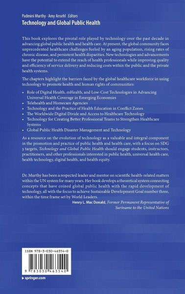 Preface.- Part I: Reflections.- Space and Global Health.- Universal Health Coverage in Japan: Leveraging Technologies to Ensure Equitable, Affordable, and Quality Health Care for All.- Georgia's Success Towards Universal Health Coverage.- Women, Girls, and STEM.- Role of New Media in Advancing Gender Equality.- Part II: Technology in Advancing Health: Meeting Sustainable Development Goal 3 Targets.- Chapter 1. Role of Digital Health, mHealth, and Low-Cost Technologies in Advancing Universal Health Coverage in Emerging Economies.- Chapter 2. Social Media and the Practice of Public Health.- Chapter 3. The Role of Technology in Women's Empowerment and Well-Being and Addressing Gender-Based Violence.- Chapter 4. Telehealth and Homecare Agencies.- Chapter 5. Health Transformation in Saudi Arabia via Connected Health Technologies- Chapter 6. Simple Technology for Menstrual Hygiene Management: A Case Study from Northern Ethiopia.- Chapter 7. Technology and the Practice of Health Education in Conflict Zones.- Chapter 8. Law, Technology, and Public Health.- Chapter 9. mHealth for Better Quality of Life, Healthier Lifestyles, and More Meaningful Lives.- Chapter 10. Digital Health Transforming Health Care in Rural and Remote Australia.- Chapter 11. Telehealth and Traumatic Brain Injury.- Chapter 12. Leveraging Technology for Attaining Sustainable Development Goal 3: The Road Ahead.- Part III: Types of Innovative Technology in Health Care.- Chapter 13. Technology vs. Mercury: The Metal that Scars Civilization.- Chapter 14. Trafficking, Technology, and Public Health: The Malignant Malady of Modern Slavery.- Chapter 15. The Worldwide Digital Divide and Access to Healthcare Technology.- Chapter 16. Technology for Creating Better Professional Teams to Strengthen Healthcare Systems.- Chapter 17. Global Public Health Disaster Management and Technology.- Chapter 18. Employing Data Science Technologies Towards Shaping a Sustainably Healthy Future: The Efforts in Contemporary Taiwan.- Chapter 19. Telemedicine in India and Its Impact on Public Health.- Chapter 20. The Role of Technology in Sustainable Development Goal Performance in Taiwan.- Chapter 21. Reducing the Burden of Oral Diseases Through Technology.- Chapter 22. Future and Impact of Rehabilitation Robotics on Post-Stroke Care and Recovery.- Epilogue.