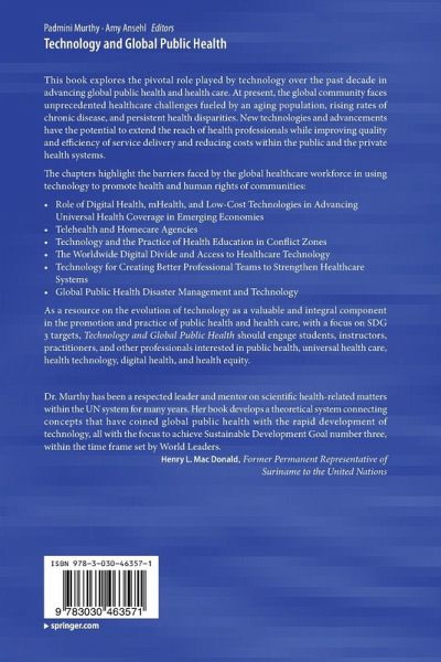 Preface.- Part I: Reflections.- Space and Global Health.- Universal Health Coverage in Japan: Leveraging Technologies to Ensure Equitable, Affordable, and Quality Health Care for All.- Georgia's Success Towards Universal Health Coverage.- Women, Girls, and STEM.- Role of New Media in Advancing Gender Equality.- Part II: Technology in Advancing Health: Meeting Sustainable Development Goal 3 Targets.- Chapter 1. Role of Digital Health, mHealth, and Low-Cost Technologies in Advancing Universal Health Coverage in Emerging Economies.- Chapter 2. Social Media and the Practice of Public Health.- Chapter 3. The Role of Technology in Women's Empowerment and Well-Being and Addressing Gender-Based Violence.- Chapter 4. Telehealth and Homecare Agencies.- Chapter 5. Health Transformation in Saudi Arabia via Connected Health Technologies- Chapter 6. Simple Technology for Menstrual Hygiene Management: A Case Study from Northern Ethiopia.- Chapter 7. Technology and the Practice of Health Education in Conflict Zones.- Chapter 8. Law, Technology, and Public Health.- Chapter 9. mHealth for Better Quality of Life, Healthier Lifestyles, and More Meaningful Lives.- Chapter 10. Digital Health Transforming Health Care in Rural and Remote Australia.- Chapter 11. Telehealth and Traumatic Brain Injury.- Chapter 12. Leveraging Technology for Attaining Sustainable Development Goal 3: The Road Ahead.- Part III: Types of Innovative Technology in Health Care.- Chapter 13. Technology vs. Mercury: The Metal that Scars Civilization.- Chapter 14. Trafficking, Technology, and Public Health: The Malignant Malady of Modern Slavery.- Chapter 15. The Worldwide Digital Divide and Access to Healthcare Technology.- Chapter 16. Technology for Creating Better Professional Teams to Strengthen Healthcare Systems.- Chapter 17. Global Public Health Disaster Management and Technology.- Chapter 18. Employing Data Science Technologies Towards Shaping a Sustainably Healthy Future: The Efforts in Contemporary Taiwan.- Chapter 19. Telemedicine in India and Its Impact on Public Health.- Chapter 20. The Role of Technology in Sustainable Development Goal Performance in Taiwan.- Chapter 21. Reducing the Burden of Oral Diseases Through Technology.- Chapter 22. Future and Impact of Rehabilitation Robotics on Post-Stroke Care and Recovery.- Epilogue.