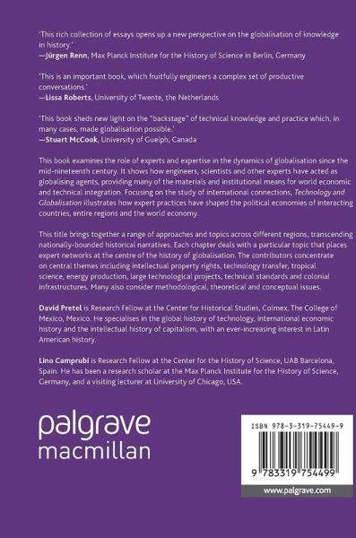 Chapter 1. Technological Encounters: Locating Experts in the History of Globalisation.- Chapter 2. The Historical Roots of Modern Bridges: China Engineers as Global Actors.- Chapter 3.- Indigenous Resistance and the Technological Imperative: From Chemistry in Birmingham to Camphor Wars in Formosa, 1860s-1914.- Chapter 4. Global Engineers: Professional Trajectories of the Graduates of the École des arts et manufactures (1830s-1920s).- Chapter 5. Re-designing Africa: Railways and Globalisation in the Era of the New Imperialism.- Chapter 6. The Global Rise of Patent Expertise during the Late Nineteenth Century.- Chapter 7. Networks of American Experts in the Caribbean: The Harvard Botanic Station in Cuba (1898-1930).- Chapter 8. Hector Vera: Breaking Global Standards: The Anti-Metric Crusade of American Engineer.- Chapter 9. Statistics as Service to Democracy: Experimental Design and the Dutiful American Scientist.- Chapter 10. The bona fide contracts: An Engineering Company in Wartime Shanghai, 1937-1945.- Chapter 11. Dutch Irrigation Engineers and Their (Post-) Colonial Irrigation Networks.- Chapter 12. Engineers and Scientist as Commercial Agents of the Spanish Nuclear Program.- Chapter 13. Engineers' Diplomacy: The South American Petroleum Institute, 1941-1950s.- Chapter 14. Epilogue: Technology's Activists and Global Dynamics.