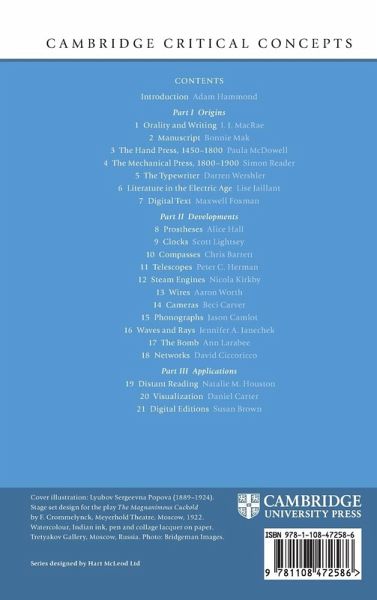List of figures List of contributors Timeline Introduction Adam Hammond Part I. Origins: 1. Orality and writing I. J. MacRae 2. Manuscript Bonnie Mak 3. The hand press, 1450-1800 Paula McDowell 4. The mechanical press, 1800-1900 Simon Reader 5. The typewriter Darren Wershler 6. Literature in the electric age Lise Jaillant 7. Digital text Maxwell Foxman Part II. Developments: 8. Prostheses Alice Hall 9. Clocks Scott Lightsey 10. Compasses Chris Barrett 11. Telescopes Peter C. Herman 12. Steam engines Nicola Kirkby 13. Wires Aaron Worth 14. Cameras Beci Carver 15. Phonographs Jason Camlot 16. Waves and rays Jennifer A. Janechek 17. The bomb Ann Larabee 18. Networks David Ciccoricco Part III. Applications: 19. Distant reading Natalie M. Houston 20. Visualization Daniel Carter 21. Digital editions Susan Brown Index.