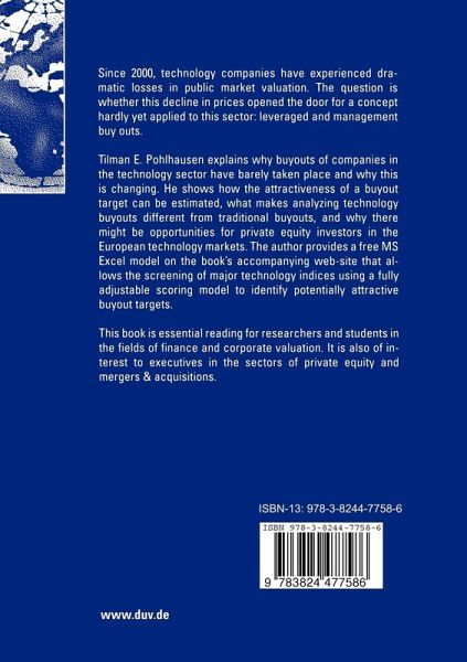 Foreword The public market valuation of technology companies throughout the 1990s is probably one of the most interesting phenomena in recent financial history. No sector has generated more enthusiasm among investors, and no sector has created more millionaires, albeit mostly on paper. Once the bubble burst, the correction process was brutal. The price of technology companies dropped by over 70 percent on average, and a significant number of companies went out of business, while others were simply avoided by the investment community. I Tilman Pohlhausen asks a valid question: Did this downturn in valuation lead to some companies being unjustly undervalued, given their past and expected cash flows? If so, he continues, would such companies be suitable for a concept rarely heard of previously for technology companies: a buyout, possibly even financed to a high degree by debt? The idea is not new. In contrast to Europe, a number of well-financed private equity funds in the United States exclusively target the technology sector for buyouts. What is new, however, is that many more technology companies, because of their lower valuation, could become targets of buyout investors in Europe, as well. Ultimately, with his analysis of the buyout attractiveness of European technology companies, the author attempts to estimate the validity of this perception.