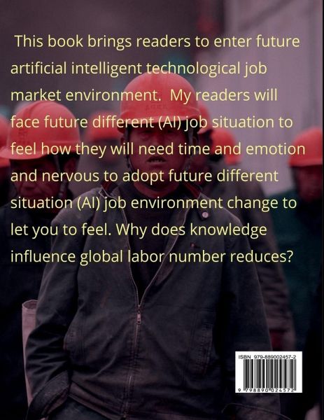 This book brings readers to enter future artificial intelligent technological job market environment. My readers will face future different (AI) job situation to feel how they will need time and emotion and nervous to adopt future different situation (AI) job environment change to let you to feel. Why does knowledge influence global labor number reduces? Advances in artificial intelligence (AI) technology is for the progress in critical areas, such as health, education, energy, economy inclusion, social welfare and the environment.Thus, it brings this question: Which (AI) workers be instead of traditional human workers in these different new markets? In recent years, machines had been used to be human's tasks in the performance of certain tasks related to intelligence , such as aspects of image recognition. Experts also forecast that rapid progress in the field of specialized artificial intelligence will continue. Then, it also brings this question: Does (AI) exceed that of human performance on more and more tasks? If it is truth, will some of human jobs to be disappeared? (AI) will be instead of human some simple jobs, then unemployment rate to the low skillful and low educated workers will be increased. Whether (AI) will be raised either production or performance or unemployment to bring human job market more advantages or more disadvantages?