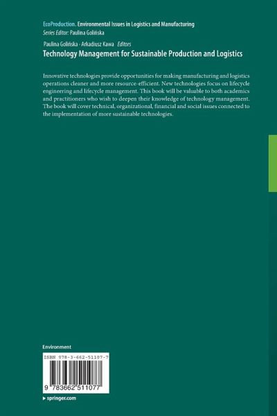 Innovative technologies provide opportunities for making manufacturing and logistics operations cleaner and more resource-efficient. New technologies focus on lifecycle engineering and lifecycle management. This book will be valuable to both academics and practitioners who wish to deepen their knowledge of technology management. The book will cover technical, organizational, financial and social issues connected to the implementation of more sustainable technologies.