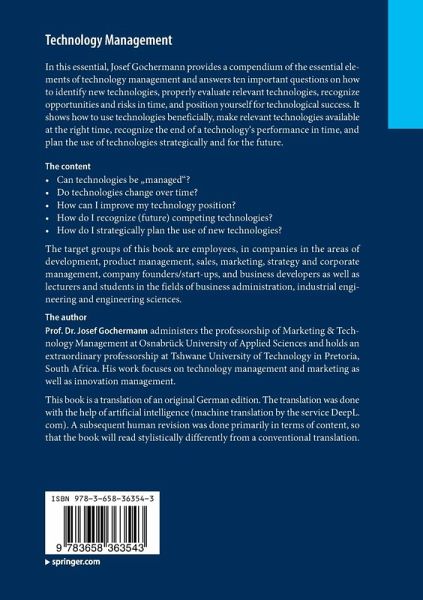In this essential, Josef Gochermann provides a compendium of the essential elements of technology management and answers ten important questions on how to identify new technologies, properly evaluate relevant technologies, recognize opportunities and risks in time, and position yourself for technological success. He shows how to use technologies beneficially, make relevant technologies available at the right time, recognize the end of a technology's performance in time, and plan the use of technologies strategically and for the future.