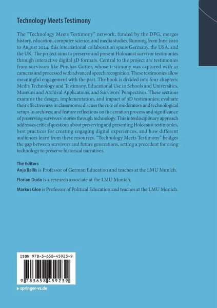 The "Technology Meets Testimony" network, funded by the DFG, merges history, education, computer science, and media studies. Running from June 2020 to August 2024, this international collaboration spans Germany, the USA, and the UK. The project aims to preserve and present Holocaust survivor testimonies through interactive digital 3D formats. Central to the project are testimonies from survivors like Pinchas Gutter, whose testimony was captured with 32 cameras and processed with advanced speech recognition. These testimonies allow meaningful engagement with the past. The book is divided into four chapters: Media Technology and Testimony, Educational Use in Schools and Universities, Museum and Archival Applications, and Survivors' Perspectives. These sections examine the design, implementation, and impact of 3D testimonies; evaluate their effectiveness in classrooms; discuss the role of moderators and technological setups in archives; and feature reflections on the creation process and significance of preserving survivors' stories through technology. This interdisciplinary approach addresses critical questions about preserving and presenting Holocaust testimonies, best practices for creating engaging digital experiences, and how different audiences learn from these resources. "Technology Meets Testimony" bridges the gap between survivors and future generations, setting a precedent for using technology to preserve historical narratives.